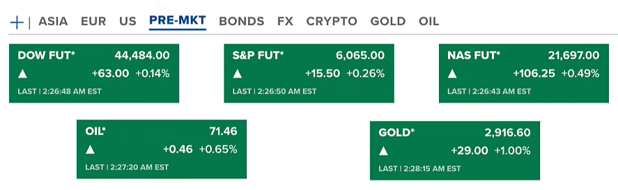 Chứng khoán Hoa Kỳ chủ nhật (09/02-US) với thị trường hợp đồng tương lai tăng ở cả ba chỉ số, trong đó Nas FUT tăng nhiều nhất 0.49%. Hợp đồng dầu có tăng nhưng vẫn mức ổn quanh 71.4 USD/thùng. Vàng tiếp tục tăng lên 2916 USD/ounce.