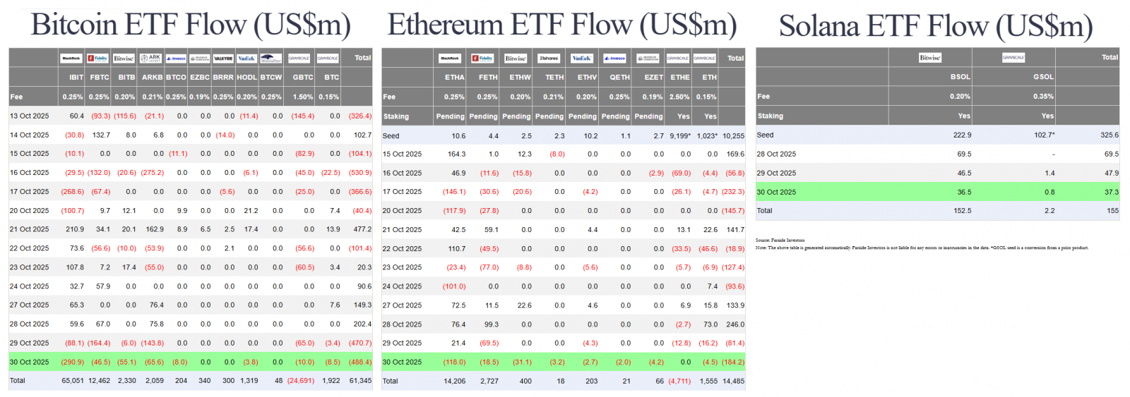 Các quỹ BTC spot ETF Hoa Kỳ trong thứ năm vẫn tiếp tục chứng khiến 488.4 triệu USD tiền rời khỏi khi BTC giảm. Tương tự, ETH spot ETF cũng có dòng tiền rời khỏi 184.2 triệu USD. Còn SOL ETF vẫn có dòng tiền vào 37.3 triệu USD.