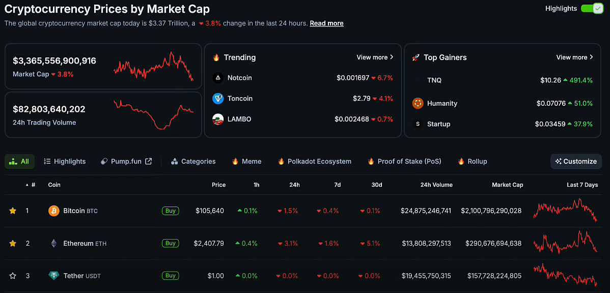 Bitcoin giảm nhẹ nhưng vẫn quanh ở 105,000 USD. Hầu hết altcoin lớn đều giảm. Vốn hóa thị trường crypto cũng giảm về 3.365 nghìn tỷ USD.