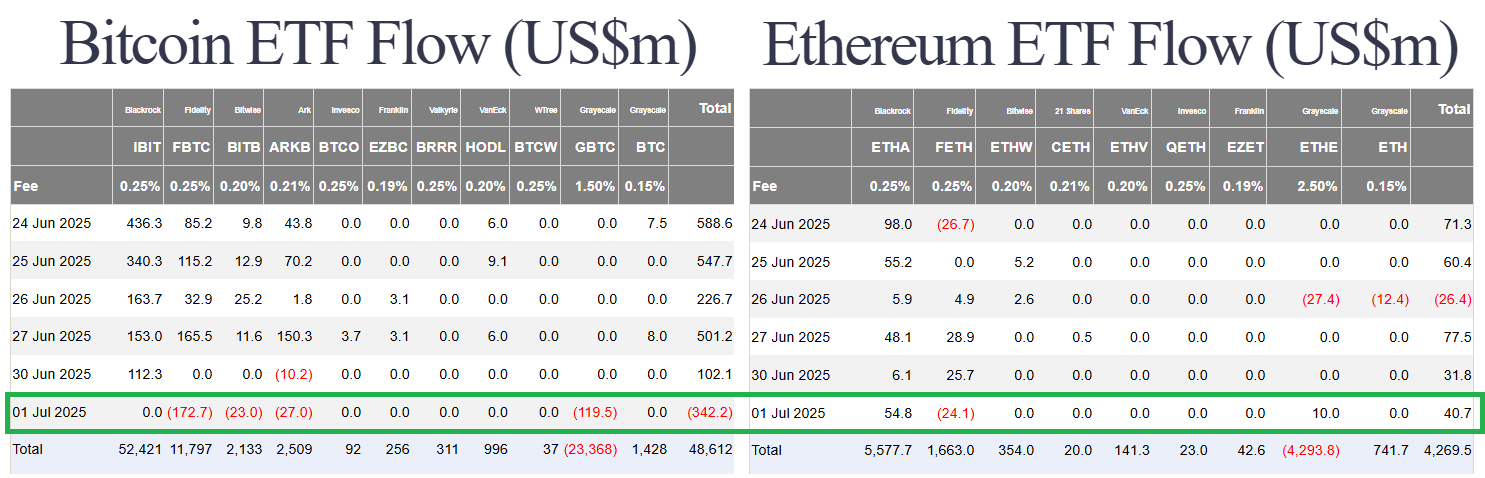 Các quỹ BTC spot ETF Hoa Kỳ sau nhiều phiên có dòng tiền vào dương thì kết thúc thứ ba đã có dòng tiền rời khỏi với tổng 342.2 triệu USD. ETH spot ETF vẫn có dòng tiền vào dương 40.7 triệu USD.