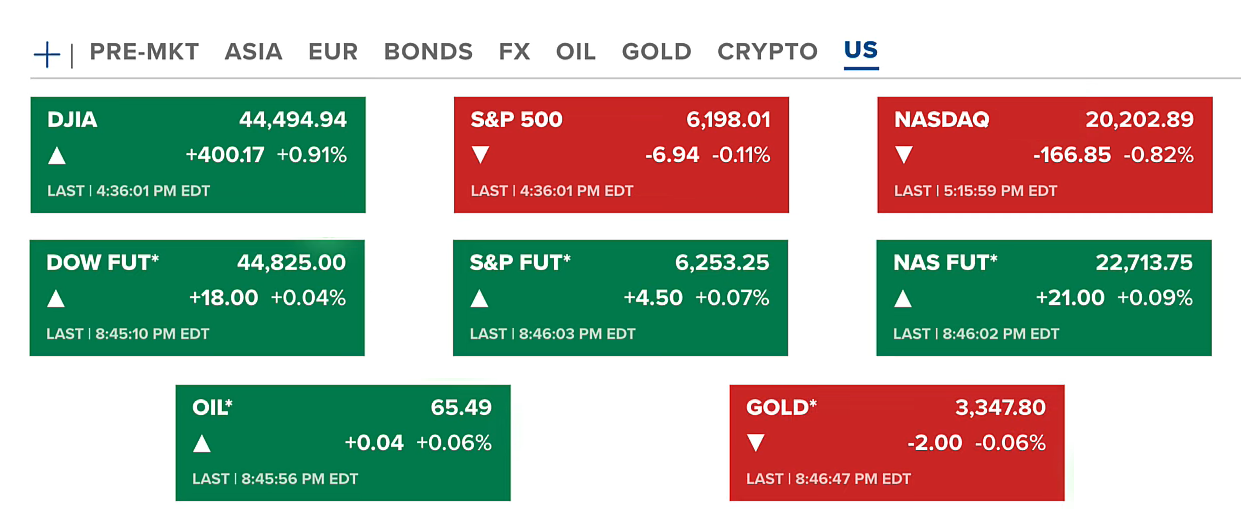 Chứng khoán Hoa Kỳ thứ ba (01/07-US) kết phiên với Dow Jones tăng 0.91%, S&P 500 lại giảm 0.11% và tương tự Nasdaq cũng giảm 0.82%. Hợp đồng tương lai của chứng khoán tăng nhẹ. Dầu tăng lên 65.4 USD/thùng. Vàng giảm không đáng kể và quanh múc 3347 USD/ounce.