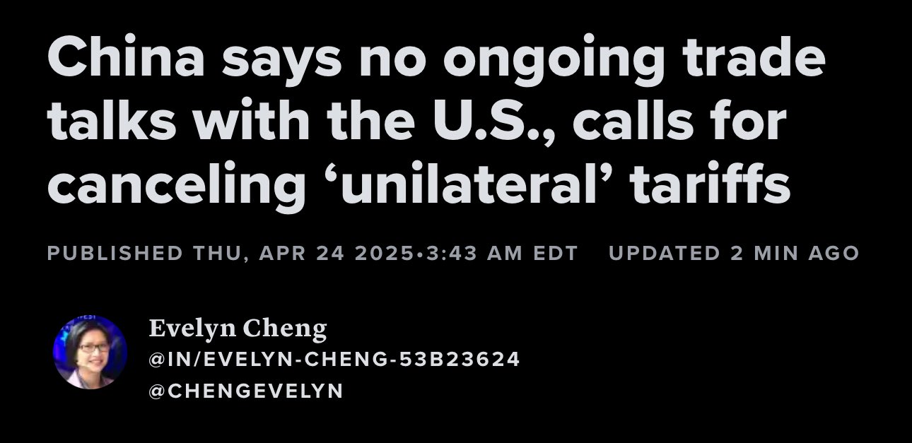 Tổng thống Trump thông báo với các phóng viên tại Phòng Bầu dục rằng các quan chức Mỹ đã gặp và tiếp tục đàm phán với các quan chức Trung Quốc, bao gồm một cuộc gặp vào thứ năm (US). Tuy nhiên, hôm qua, một phát ngôn viên Bộ Ngoại giao Trung Quốc phủ nhận rằng Mỹ và Trung Quốc có bất kỳ cuộc thảo luận nào về thuế quan.