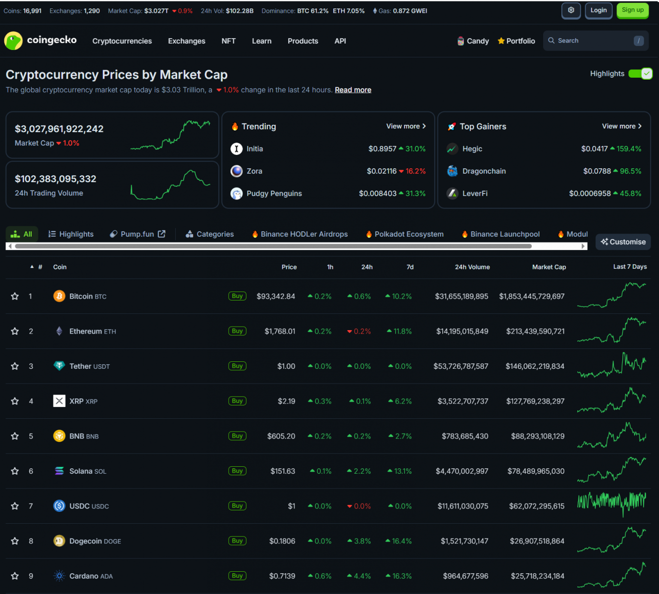 Còn Bitcoin vẫn giữ quanh mức 93,000 USD sau khi hồi phục. Hầu hết altcoin lớn đều tăng nhẹ. Vốn hóa thị trường crypto là 3.027 nghìn tỷ USD.