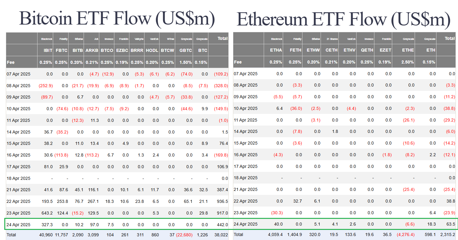 Các quỹ BTC spot ETF Hoa Kỳ trong phiên thứ năm (24/04-US) vẫn tiếp tục có dòng tiền vào dương với tổng 442 triệu USD. Trong đó, phần lớn dòng tiền đến từ 327 triệu USD. Còn ETH spot ETF cũng có dòng tiền vào dương 63.5 triệu USD.