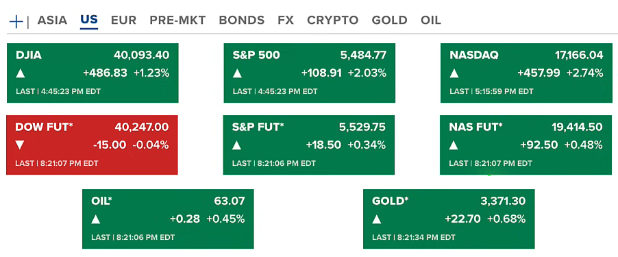 Chứng khoán Hoa Kỳ thứ năm (24/04-US) với ba chỉ số đều hồi phục sau tin thuế quan và kết thúc phiên tăng điểm, Nasdaq tăng nhiều nhất 2.74%. Hợp đồng tương lai của chứng khoán cũng tăng nhẹ ở S&P FUT và Nas FUT. Dầu vẫn quanh 63 USD/thùng. Vàng tăng lên 3371 USD/ounce.