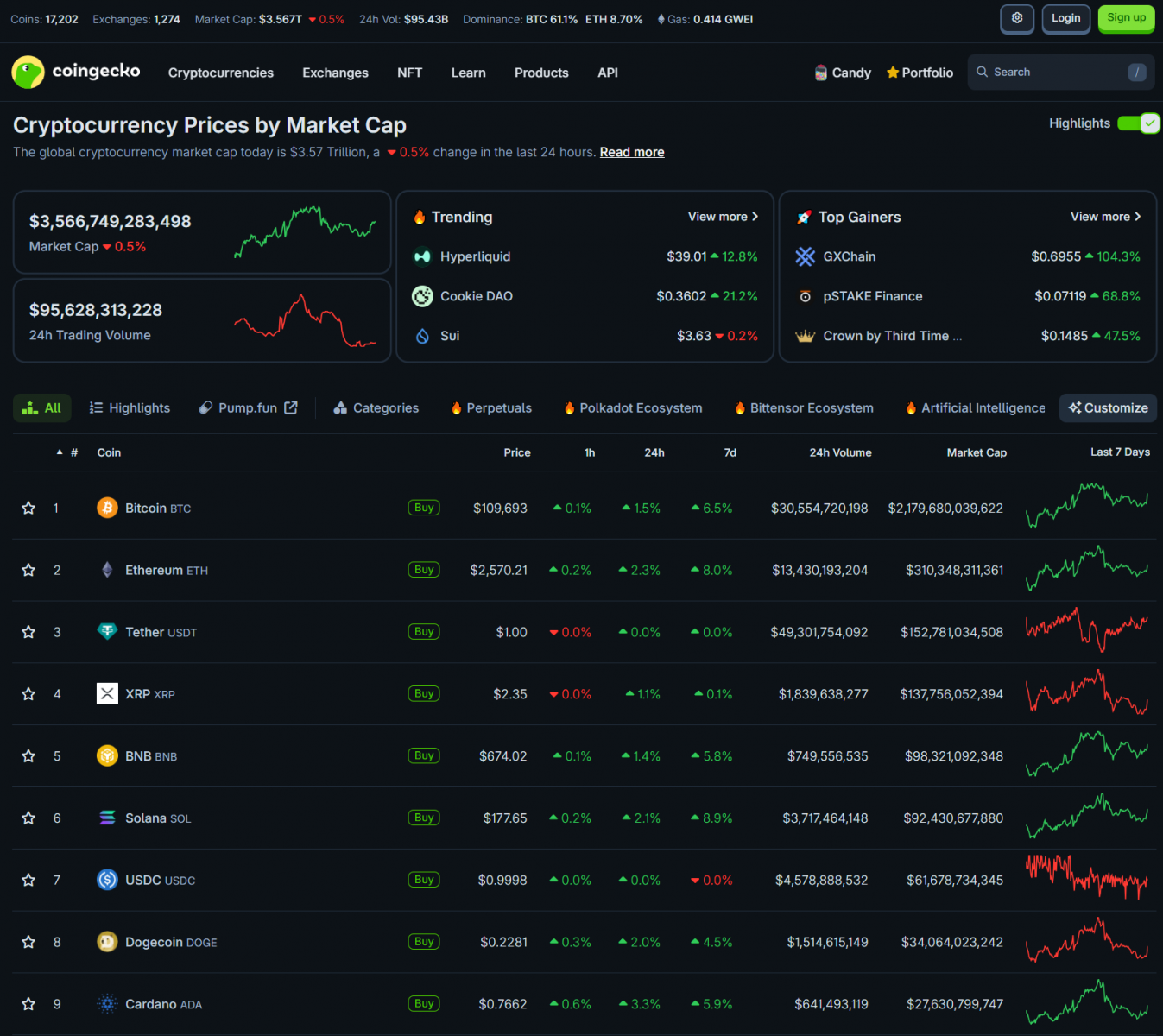 Bitcoin ngày qua đã có nhịp tăng lên 109,000 USD. Hầu hết các altcoin đều tăng. Vốn hóa thị trường crypto tăng lên 3.566 nghìn tỷ USD.