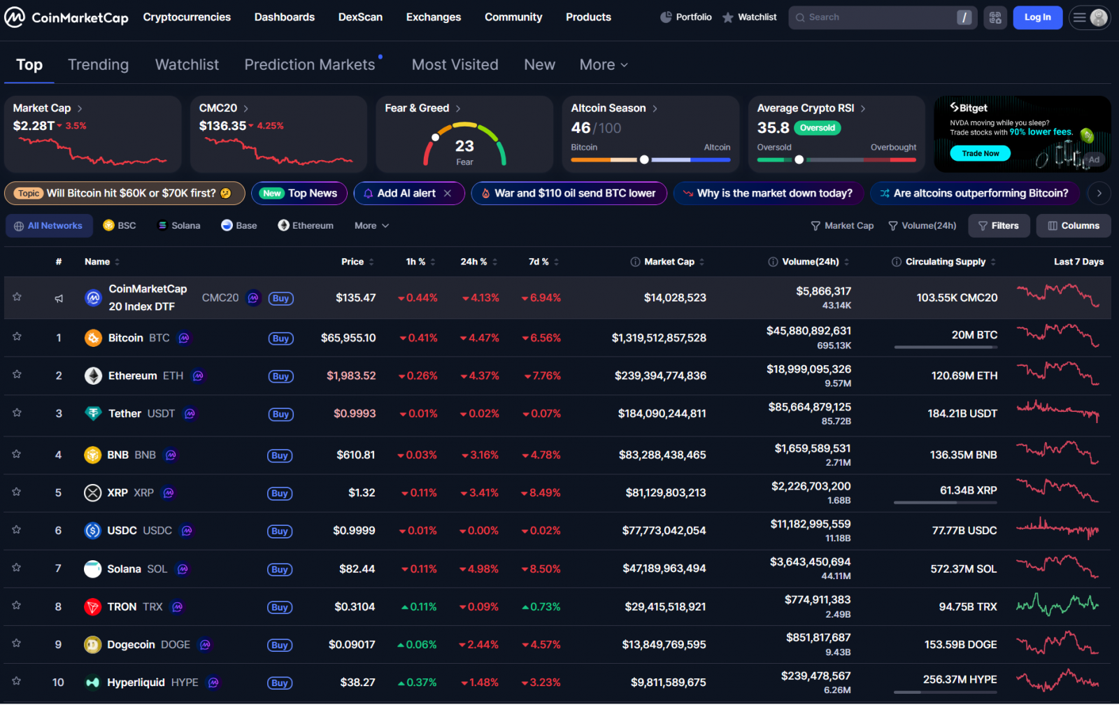 Bitcoin đã có nhịp điều chỉnh đán kể về 65,000 USD. Hầu hết altcoin lớn cũng đều giảm cùng nhịp. Vốn hóa thị trường crypto giảm về 2.28 nghìn tỷ USD.