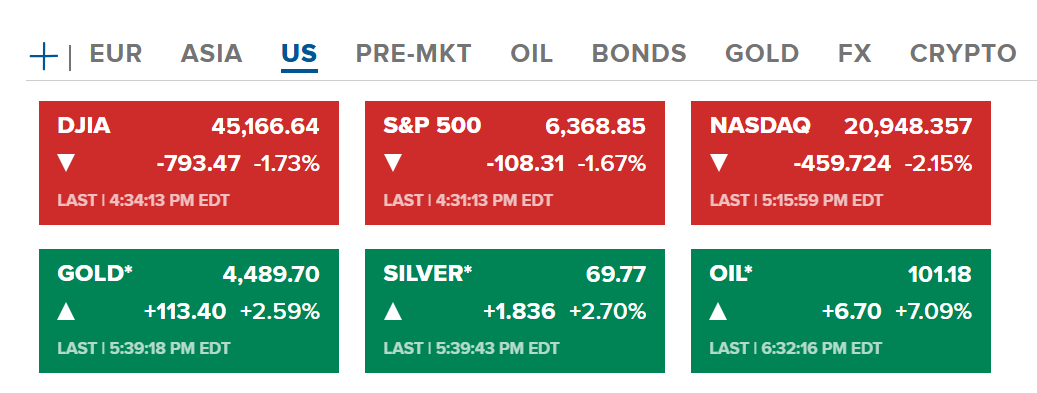 Chứng khoán Hoa Kỳ thứ sáu (27/03-US) kết thúc phiên tiếp tục giảm điểm đáng kể, với Nasdaq giảm nhiều nhất 2.15%. Hợp đồng tương lai của vàng và bạc tăng nhẹ sau phiên giảm trước đó về quanh 4489 USD/ounce và 69.77 USD/ounce. Dầu tăng mạnh lên hơn 101.18 USD/thùng.