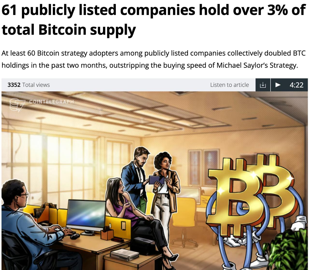 Theo báo cáo của Standard Chartered. Hiện có 61 công ty niêm yết trên sàn chứng khoán đang nắm giữ tổng cộng khoảng 673.900 BTC, chiếm khoảng 3.2% lượng Bitcoin toàn cầu. Trong hai tháng qua, họ đã mua thêm Bitcoin, từ khoảng 50.000 BTC lên 100.000 BTC, nhanh hơn cả MicroStrategy.