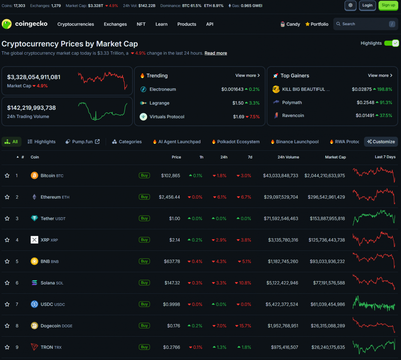Bitcoin có nhịp giảm về quanh 102,000 USD. Nhiều altcoin lớn giảm mạnh. Vốn hóa thị trường crypto là 3.328 nghìn tỷ USD.