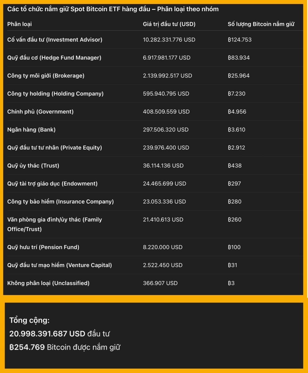 Bên cạnh các công ty tích lũy trực tiếp BTC, dưới đây là các công ty đang sở hữu Bitcoin ETF dựa trên hồ sơ 13F của SEC. Đây là các tổ chức quản lý danh mục đầu tư trị giá ít nhất 100 triệu USD trở lên tại Mỹ.