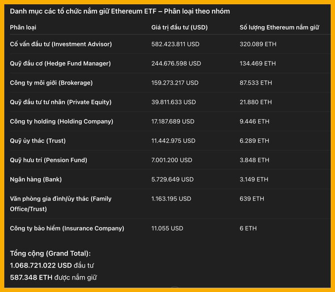 Tương tự, cũng có thống kê các doanh nghiệp nắm giữ ETH spot ETF. Xu hướng tương tự cũng diễn ra với ETH spot ETF, cho thấy sự mở rộng rõ rệt trong việc tích hợp tài sản kỹ thuật số vào danh mục đầu tư tổ chức.