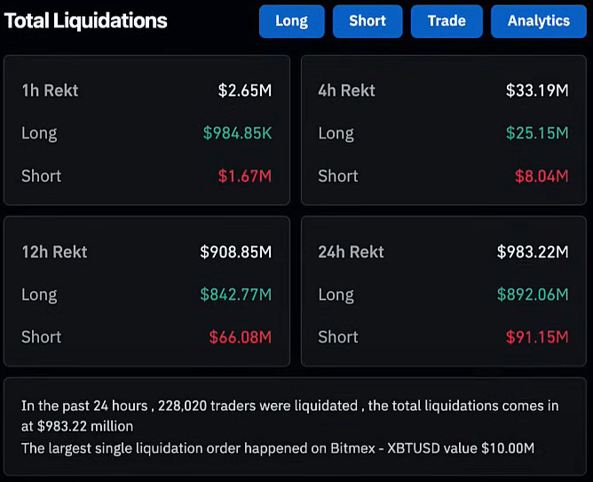 Trong thời gian ngắn, đã có số lượng lớn lệnh đòn bẩy trong thị trường crypto bị thanh lý. Và trong vòng 24 giờ, có đến 983 triệu USD lệnh đòn bẩy thanh lý và phần lớn là lệnh Long.