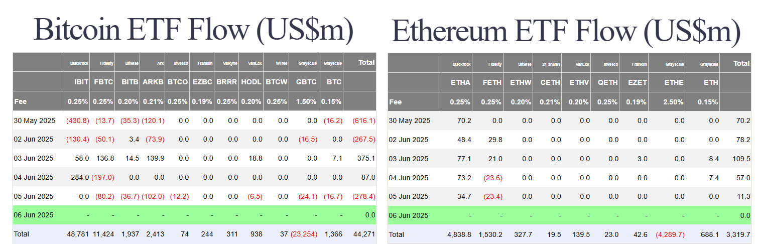 Bitcoin spot ETF thứ năm đã có dòng tiền rời khỏi với tổng 278.4 triệu USD. Còn ETH spot ETF vẫn có dòng tiền vào 11.3 triệu USD.
