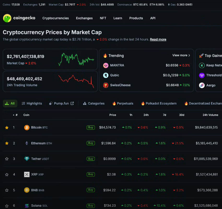 Bitcoin vẫn quanh mức 84,500 USD và không thay đổi nhiều về giá so với ngày trước đó. Các altcoin không biến động nhiều, một số đồng tăng nhẹ và một số đồng giảm. Vốn hóa thị trường crypto là 2.76 nghìn tỷ USD.