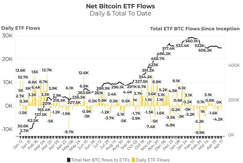 Thống kê cho thấy, dòng tiền vào Bitcoin ETF cho thấy dòng vốn mạnh trong suốt năm 2024. Dòng tiền bắt đầu rút ra từ tháng 1/2025 đến cuối tháng 3, trùng với đợt điều chỉnh của Bitcoin và thị trường chứng khoán Mỹ liên quan đến căng thẳng thương mại. Mặc dù tâm lý thị trường nhìn chung vẫn tiêu cực, nhưng dòng tiền rút ra đã giảm và tổng tài sản ròng trong các Bitcoin ETF hiện đã ổn định.