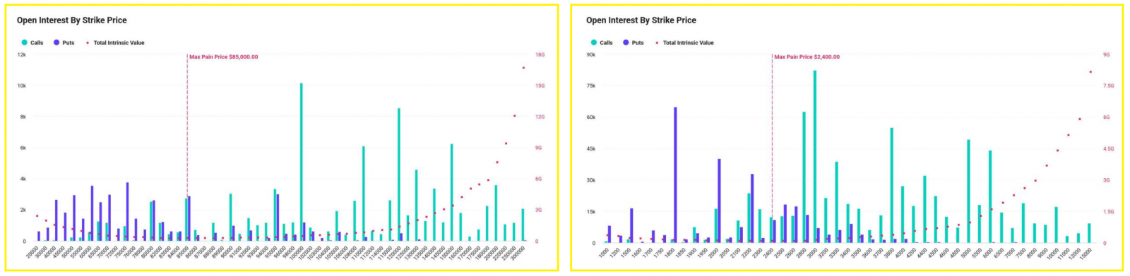 Vào 15h thứ Sáu (giờ Việt Nam), tương đương 1h sáng tại California, thị trường quyền chọn trên Deribit sẽ chứng kiến 139.000 BTC (~12 tỷ USD) đáo hạn, với mức Max Pain được xác định tại 85.000 USD. Đối với Ethereum, giá Max Pain là 2.400 USD, với tổng giá trị hợp đồng đáo hạn lên tới 2,2 tỷ USD. Có nhiều thời điểm, giá có xu hướng di chuyển về giá Max Pain bởi ở mức giá này sẽ có nhiều nhà đầu tư lỗ nhất.