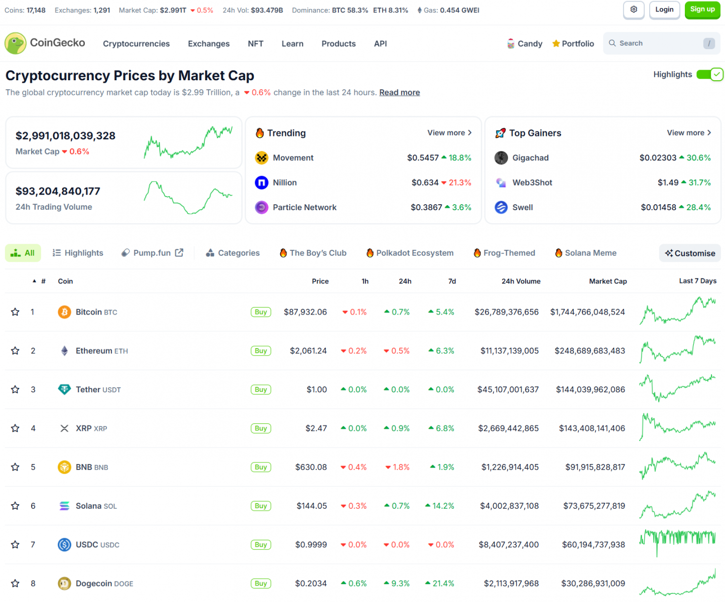 Về crypto, Bitcoin ở mức 87,900 USD. Nhiều altcoin lớn tăng đáng kể, như SOL tăng 14%. Vốn hóa thị trường crypto tăng lên 2.99 nghìn tỷ USD.