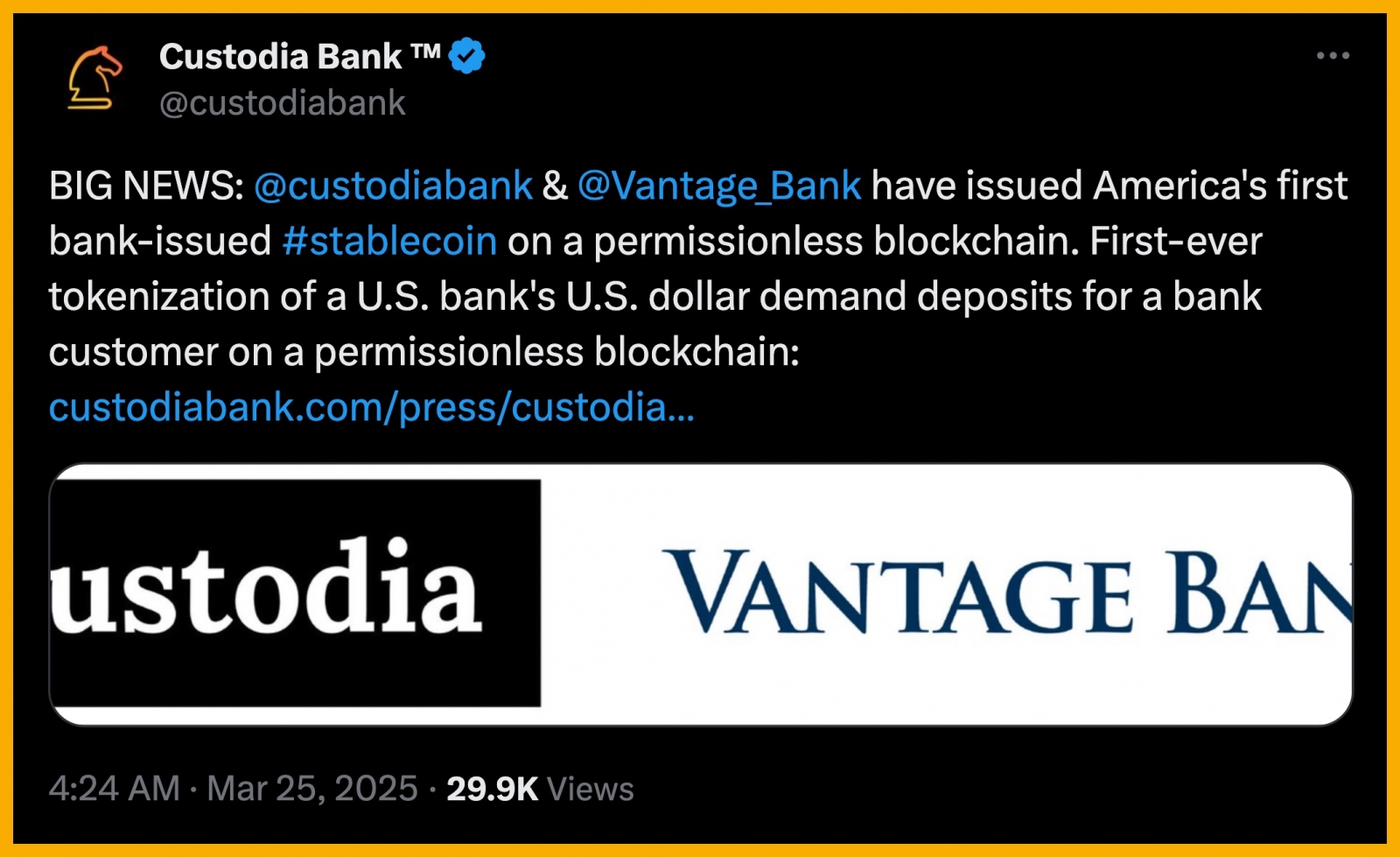 Bên cạnh công ty của tổng thống Trump, một số ngân hàng ở Hoa Kỳ bắt đầu phát hành stablecoin khi các quy định SAB 121 bị hủy bỏ. Mới đây, Custodia & Vantage Bank Ra Mắt Stablecoin Đầu Tiên Do Ngân Hàng Hoa Kỳ Phát Hành Trên Ethereum.