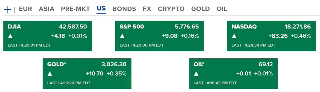 Chứng khoán Hoa Kỳ thứ ba (25/03) kết thúc với màu xanh ở cả ba chỉ số, Nasdaq tăng nhiều nhất với 0.46%. Hợp đồng vàng tăng nhẹ lên 3026 USD/ounce. Dầu ở mức 69 USD/thùng.