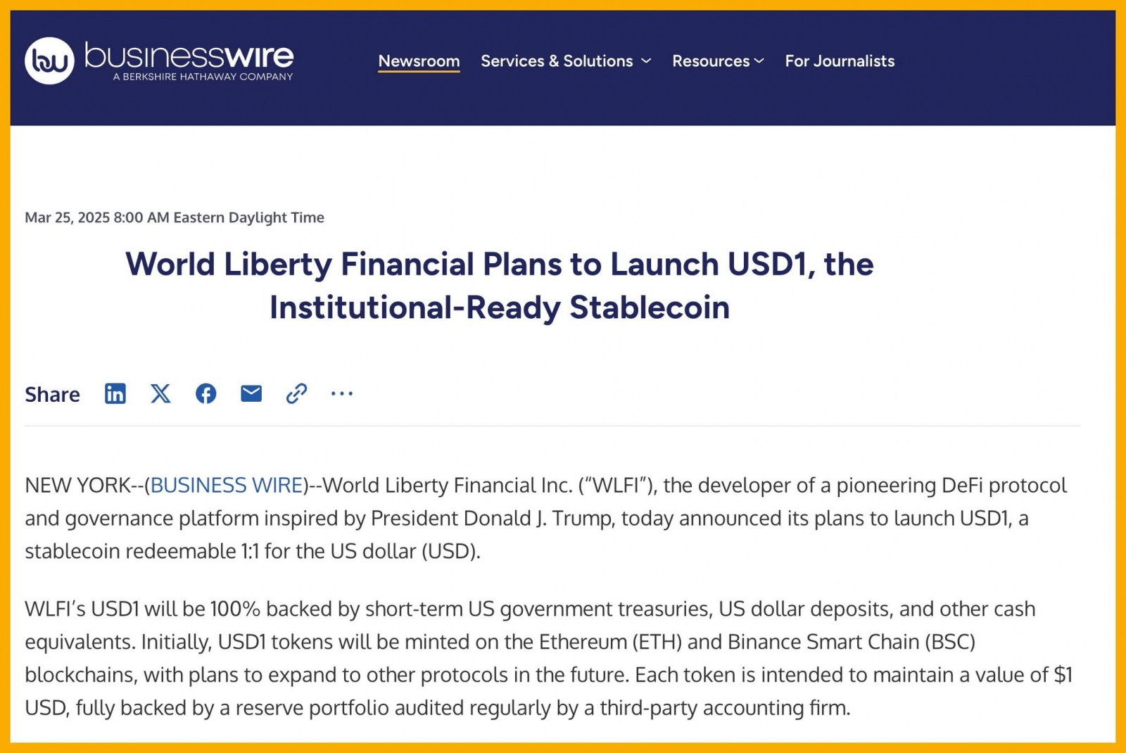 World Liberty Financial (WLFI) được hậu thuẫn bởi tổng thống Trump đã công bố ra mắt USD1, một stablecoin được neo giá 1:1 với đồng đô la Mỹ. Đồng USD1 được hướng đến dùng cho các nhà đầu tư tổ chức hơn là các khách hàng cá nhân. Do đó, nó sẽ không cạnh tranh trực tiếp với Circle hay Tether.