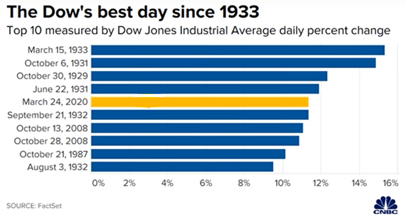 Sau khi có những thông tin tích cực và mọi người đều hi vọng với gói cứu trợ thì hôm nay thị trường chứng khoán Mỹ đã tăng giá khá nhiều. Chỉ số Dow Jones tăng 11,3%, chỉ số S&P tăng 9,38% và Nasdaq tăng 8,12%.