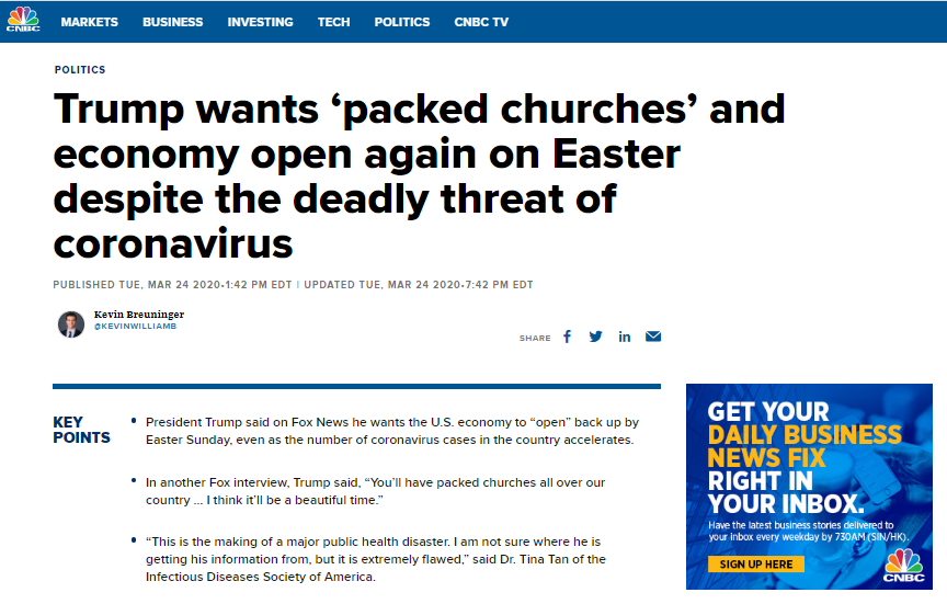 Tổng thống Trump muốn mở cửa lại hoạt động tài chính trước ngày 14/4. Ông cho rằng khi cho người dân nghỉ ở nhà 15 ngày để ngăn chặn lây lan dịch bệnh, đây là sự hi sinh kinh tế để có sự an toàn. Đồng thời, khi đóng cửa hoạt động kinh tế theo khuyến cáo của các tổ chức y tế sẽ gây ra sự thất thoát tài chính sẽ gây ra thất nghiệp, thiệt hại nhiều hơn rất nhiều so với dịch bệnh.