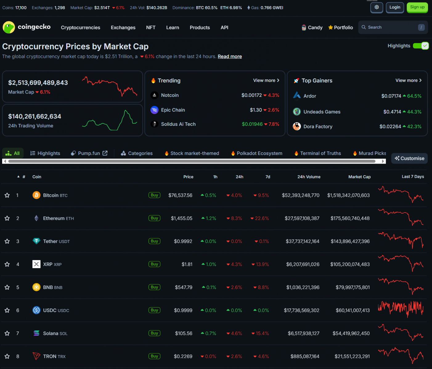 Bitcoin cũng tiếp tục giảm xuống 76,000 USD. Hầu hết altcoin đều giảm. Vốn hóa thị trường crypto cũng giảm xuống 2.5 nghìn tỷ USD. Crypto vẫn có những tin tức tốt nhưng giá vẫn giảm bởi thuế quan.