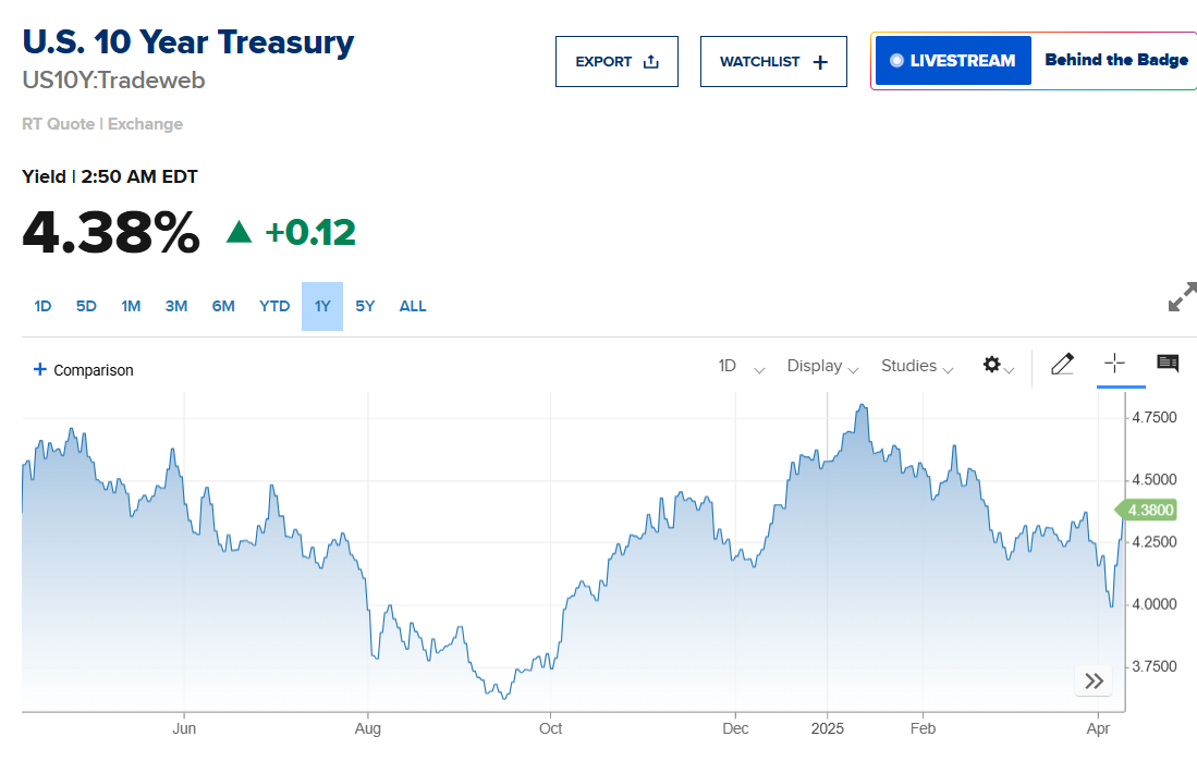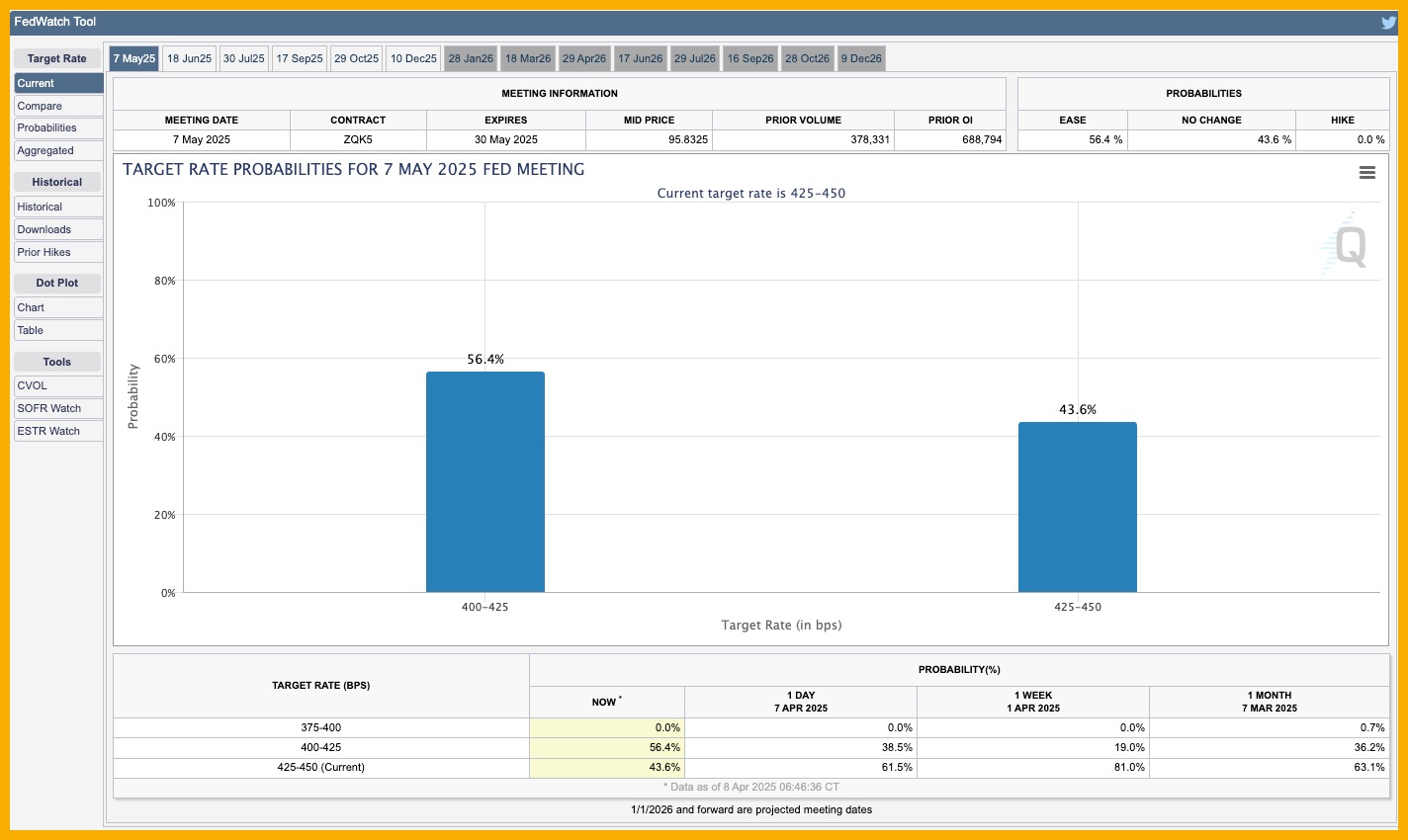 Với căng thẳng thuế quan, Chủ tịch Fed Jerome Powell có thể giả vờ rằng ông không cần can thiệp, nhưng thị trường sắp kéo ông vào cuộc dù ông có muốn hay không. Công trái phiếu 10 năm của Hoa Kỳ đã tăng mạnh từ 3.9% lên 4.38%.Hợp đồng CME của FED cho thấy 56.4% nghiêng về khả năng FED sẽ phải giảm lãi suất trong cuộc họp ngày 7 tháng 5.