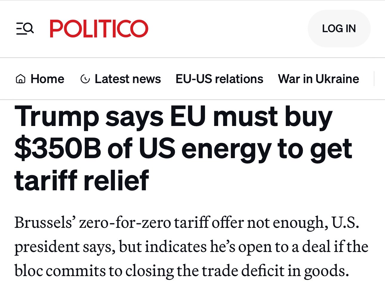 Một số quốc gia, khu vực tiếp tục có những động thái về thuế qua. Tổng thống Trump cho biết Liên minh châu Âu sẽ phải cam kết mua 350 tỷ USD năng lượng từ Mỹ thì mới được xem xét miễn trừ khỏi các mức thuế do ông áp đặt. Ông cũng bác bỏ đề xuất “zero-for-zero” của Chủ tịch Ủy ban châu Âu Ursula von der Leyen về việc cùng nhau xóa bỏ thuế đối với ô tô và hàng công nghiệp.