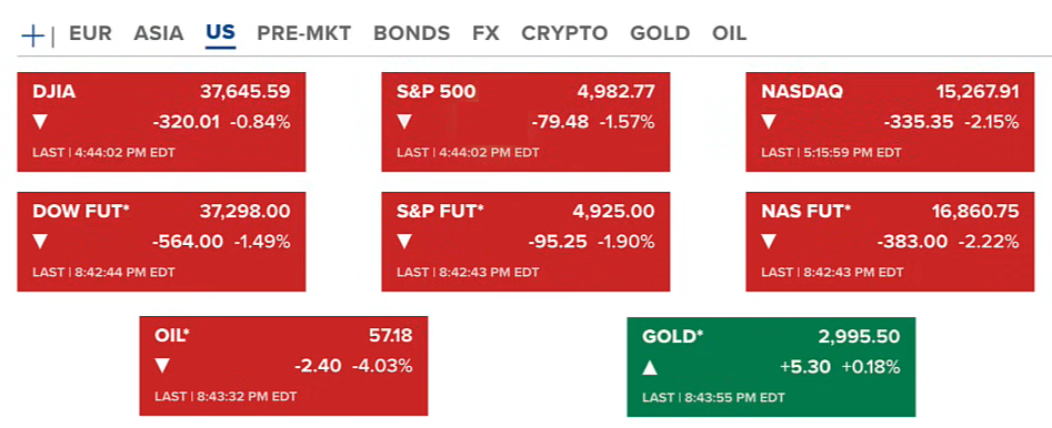 Chứng khoán Hoa Kỳ thứ ba (08/04) tiếp tục giảm ở cả ba chỉ số. Hợp đồng tương lai của chứng khoán cũng cùng xu hướng giảm. Giá dầu đã giảm mạnh xuống 57 USD/thùng. Vàng hồi nhẹ ở mức 2995 USD/ounce.