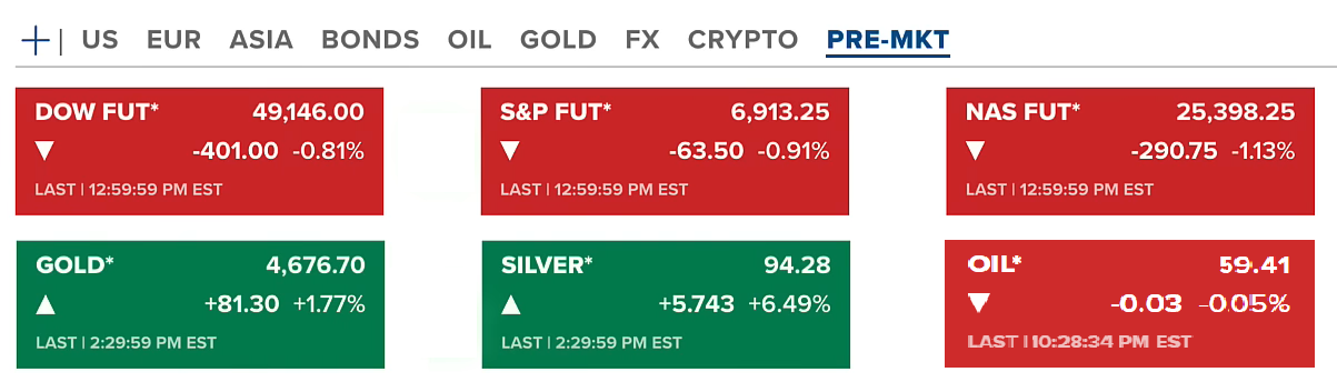 Phản ứng ban đầu thể hiện rõ trên thị trường futures (19/01-US) khi cả ba chỉ số chính của Mỹ đều giảm, cho thấy tâm lý thận trọng và định giá lại rủi ro của nhà đầu tư. Giá dầu gần như không biến động giữ quanh 59.41 USD/thùng. Trong khi đó, vàng và bạc tăng mạnh, cùng lập đỉnh mới quanh 4676 USD/ounce và 94.28 USD/ounce.