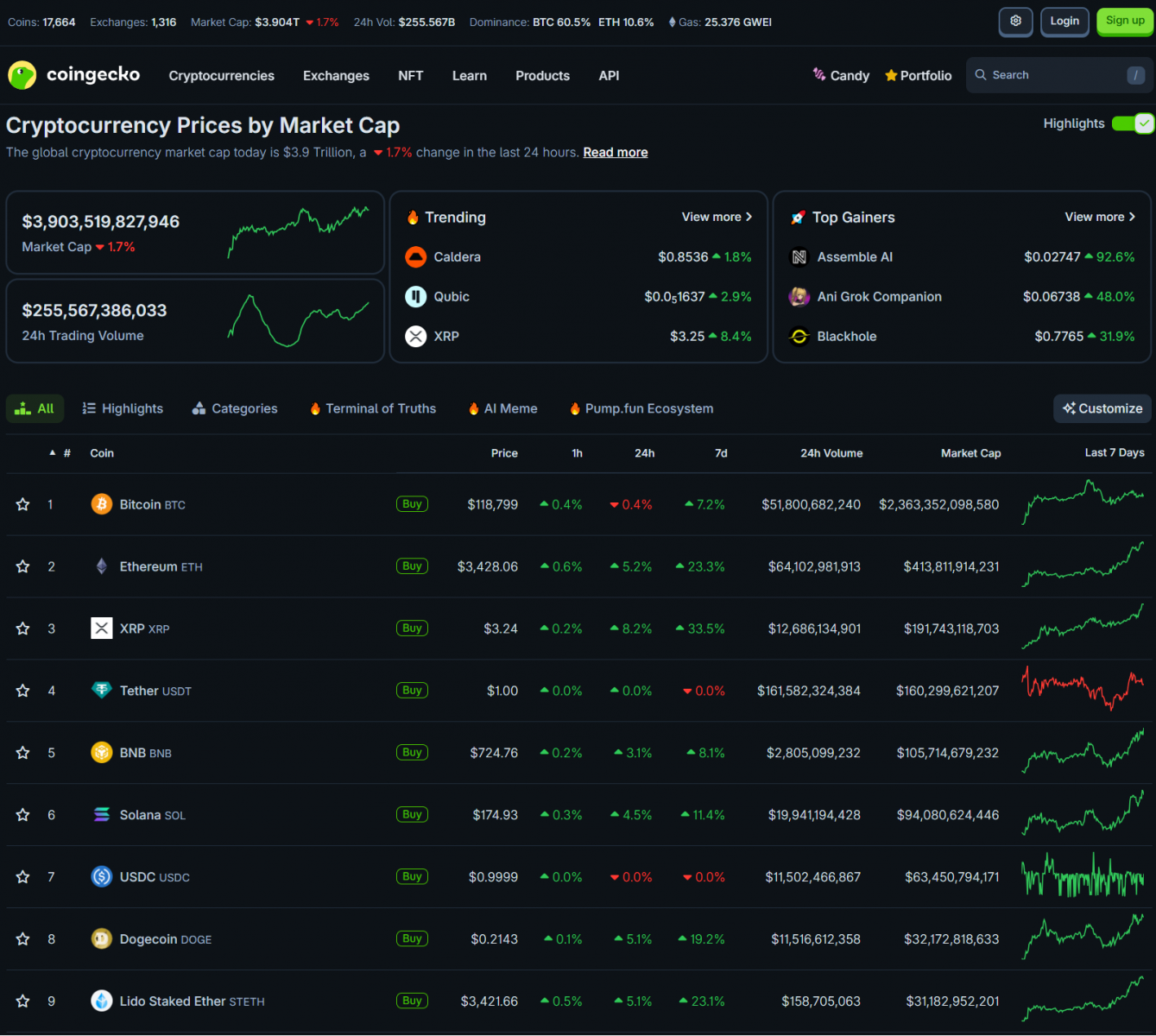 Bitcoin vẫn giữa quanh 118,000 USD và có thời điểm đã tăng lên 119,000 USD sau đó điều chỉnh trở lại. Các altcoin lớn đã có sự tăng trưởng rất tốt. Vốn hóa thị trường crypto ở mức 3.9 nghìn tỷ USD.