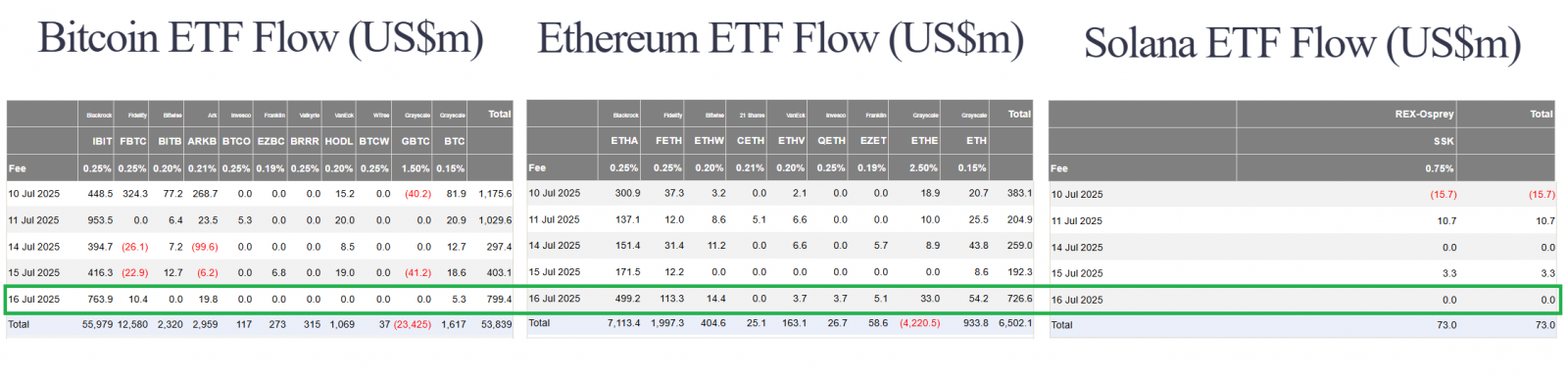 Các quỹ BTC spot ETF Hoa Kỳ tiếp tục có dòng tiền vào lớn với tổng 799 triệu USD. ETH spot ETF cũng có dòng tiền vào rất lớn 726 triệu USD cho thấy hứng thú của các tổ chức với ETH đang rất lớn. Còn SOL spot ETF có dòng tiền bằng 0.