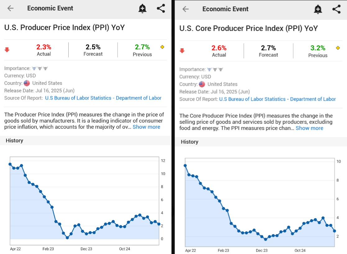 Báo cáo Chỉ số PPI tháng vừa qua đạt 2.3%, thấp hơn mức dự báo 2.5% và giảm mạnh so với kỳ trước ở mức 3.2%. PPI lõi (Core PPI) ghi nhận ở mức 2.6%, cũng thấp hơn dự báo 2.7% và giảm so với kỳ trước là 3.2%. Điều này cho thấy áp lực lạm phát từ khâu sản xuất đang hạ nhiệt, tạo kỳ vọng CPI sẽ tiếp tục giảm trong tương lai.