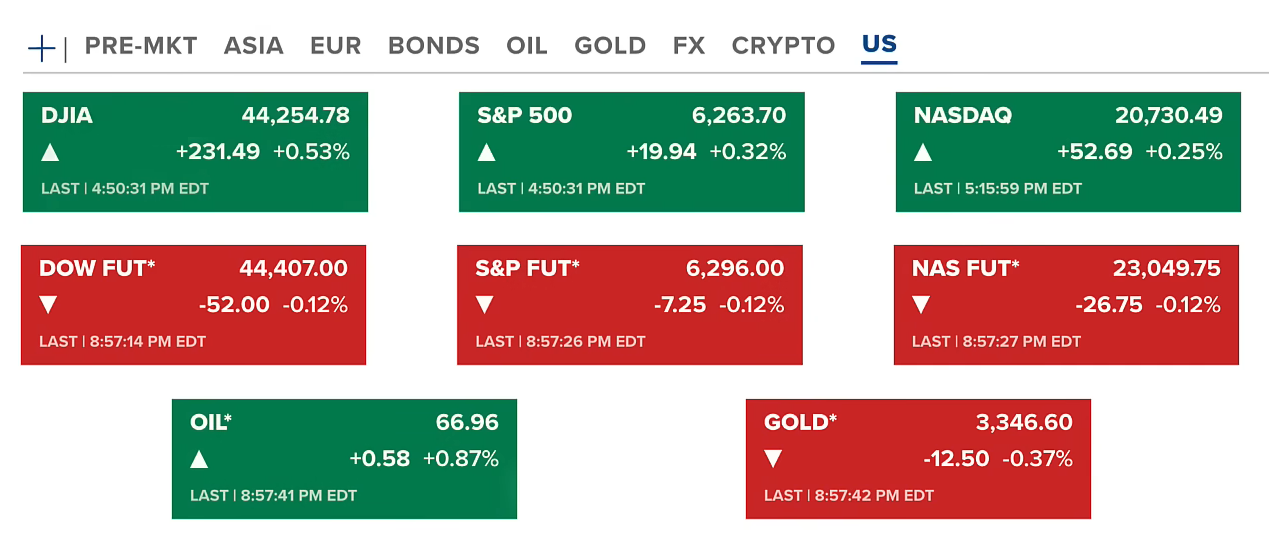 Chứng khoán Hoa Kỳ thứ tư (16/07-US), cả ba chỉ số chứng khoán đều tăng nhẹ, với Dow Jones tăng nhiều nhất 0.53%. Hợp đồng tương lai của chứng khoán giảm nhẹ đều 0.12%. Hợp đầu dầu ở mức 66.96 USD/thùng. Vàng giảm nhẹ quanh 3346 USD/ounce.