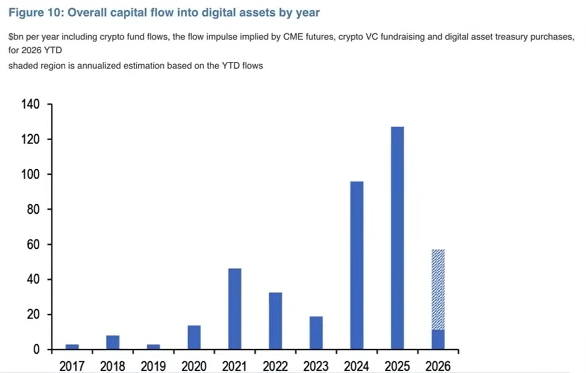 Và dòng tiền vào thị trường crypto năm 2026 dự báo thấp hơn hẳn 2025. Các nhà phân tích JPMorgan cũng cho thấy tổng dòng vốn tài sản kỹ thuật số đạt khoảng 11 tỷ USD trong quý 1 năm 2026, chỉ bằng khoảng một phần ba so với cùng kỳ năm ngoái. Phần lớn dòng vốn chảy vào đến từ các quỹ đầu tư chiến lược và quỹ đầu tư mạo hiểm.