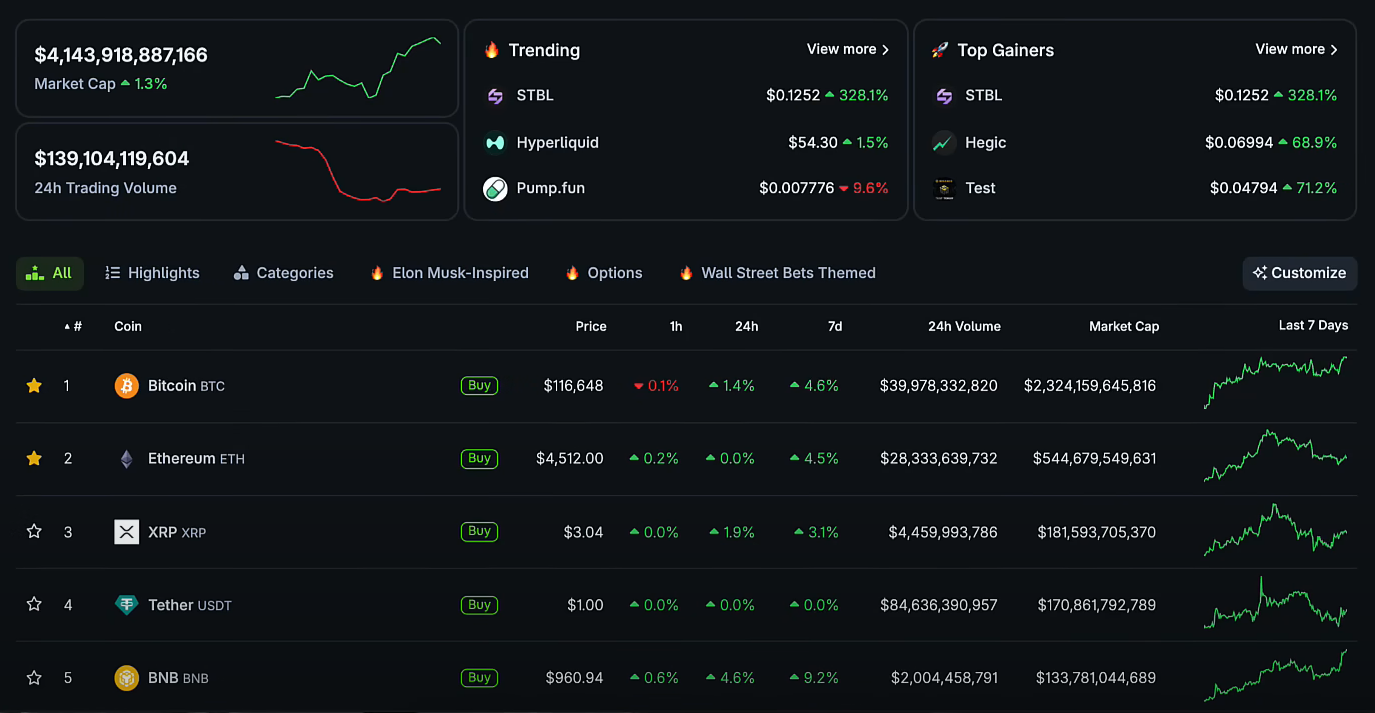 Về phần tiền điện tử, Bitcoin đã tăng lên mức 116,000 USD sau khi trải qua điều chỉnh ngày trước. Hầu hết các loại tiền điện tử thay thế lớn đều tăng giá. Tổng giá trị thị trường tiền điện tử đã nhẹ nhàng tăng lên 4.14 nghìn tỷ USD.