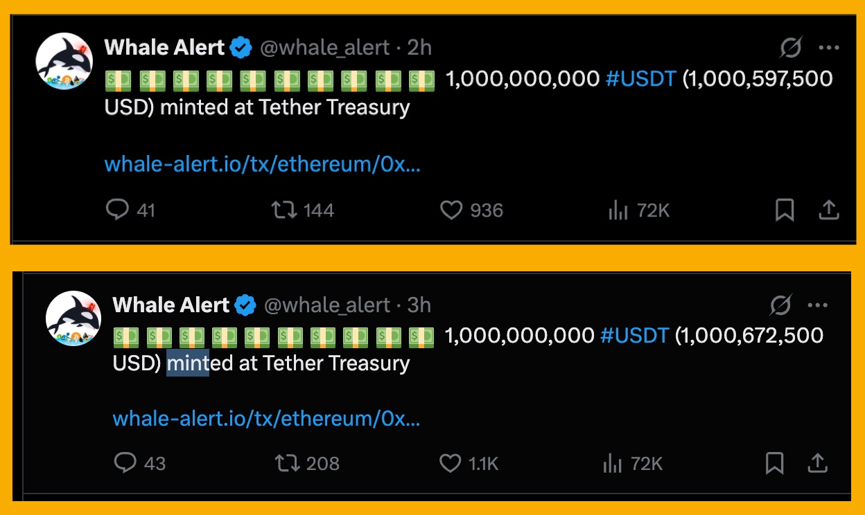 Trong ngày hôm nay, Tether vừa phát hành thêm 2 tỷ USDT trên mạng Ethereum, dẫn đến tăng vốn hóa và đạt mức cao mới.