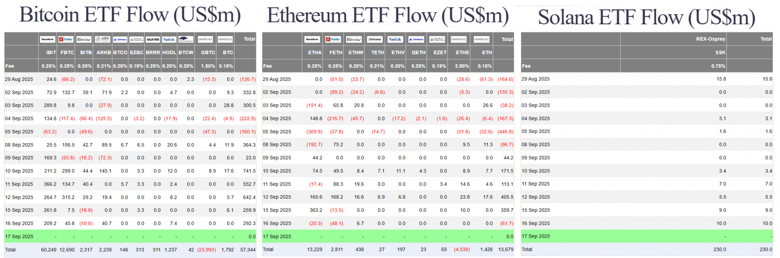 Trong ngày thứ ba (16/09) tại Hoa Kỳ, quỹ giao dịch BTC spot ETF đã thu hút hơn 293 triệu USD. Trái lại, quỹ giao dịch ETH spot ETF lại ghi nhận dòng tiền rời tổng cộng 61.7 triệu USD. Riêng quỹ giao dịch SOL ETF đã có 10 triệu USD dòng tiền vào.