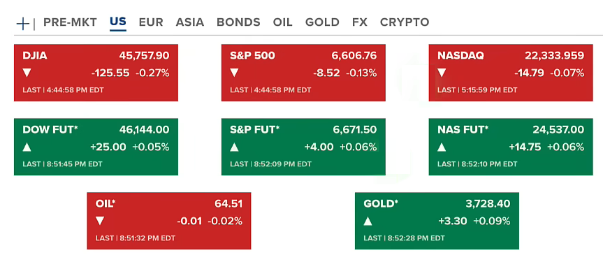 Trong ngày thứ ba tại Hoa Kỳ (16/09), thị trường chứng khoán Hoa Kỳ đã kết thúc phiên với sự giảm điểm ở cả ba chỉ số, với Dow Jones giảm mạnh nhất 0.27%. Tuy vậy, chỉ số S&P đã ghi nhận đỉnh mới trong phiên giao dịch và kết thúc với sự điều chỉnh nhẹ. Hợp đồng tương lai chứng khoán cũng tăng nhẹ. Giá dầu duy trì ở mức 65 USD/thùng, trong khi giá vàng đã tăng lên mức 3728 USD/ounce.