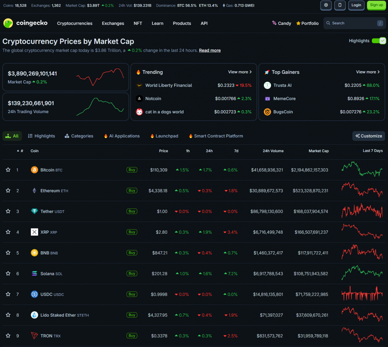 Bitcoin quanh ở mức 109,000 USD và có thời điểm trăng nhẹ lên 110,000 USD. Các altcoin lớn có một số đồng tăng, một số giảm nhẹ. Vốn hóa thị trường crypto là 3.89 nghìn tỷ USD.