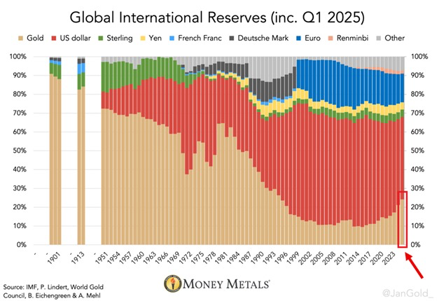 Đồng đô la Mỹ hiện vẫn là đồng tiền dự trữ chính của thế giới, chiếm khoảng 42% nhưng đã giảm xuống mức thấp nhất kể từ thập niên 1990. Trong khi đó, vàng ngày càng trở thành tài sản thay thế đáng tin cậy, với tỷ lệ chiếm 24% dự trữ toàn cầu trong quý 1 năm nay, mức cao nhất trong 30 năm và đã vượt qua cả đồng euro để trở thành tài sản dự trữ lớn thứ hai.