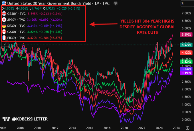 Song song đó, dữ liệu từ Kobe Ladder cho thấy trong năm 2024, 74% ngân hàng trung ương toàn cầu đã cắt giảm lãi suất, với ít nhất 15 lần hạ lãi suất tính đến tháng 5. Tuy nhiên, trái phiếu chính phủ dài hạn lại tăng lợi suất, phản ánh sự hoài nghi của thị trường về hiệu quả các biện pháp này và lo ngại lạm phát quay trở lại. Đặc biệt, Mỹ chưa hề giảm lãi suất trong năm nay, giữ mức cao để duy trì dư địa chính sách trong trường hợp khủng hoảng xảy ra. Đây có thể là một lợi thế, bởi khi khủng hoảng hay suy thoái xuất hiện, Fed vẫn còn khoảng trống để cắt giảm, khác với các quốc gia có lãi suất gần bằng 0 hoặc âm như Nhật Bản.
