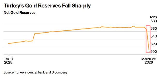 Ngân hàng trung ương Thổ Nhĩ Kỳ đã bán khoảng 58 tấn vàng (hơn 8 tỷ USD) chỉ trong 2 tuần, mức giảm mạnh nhất trong 7 năm, khiến dự trữ còn khoảng 513 tấn. Một phần lớn số vàng được dùng để vay USD, phần còn lại bán trực tiếp ra thị trường, và riêng lượng bán này đã lớn hơn toàn bộ dòng tiền rút khỏi các quỹ ETF vàng toàn cầu cùng thời điểm.
