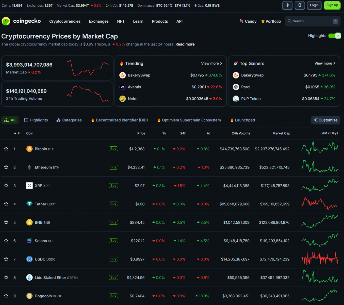 Bitcoin hiện đang dao động quanh mức 112,000 USD. Các đồng tiền điện tử thay thế lớn chủ yếu đang ổn định hoặc giảm nhẹ. Tổng vốn hóa thị trường tiền điện tử giảm xuống 3.99 nghìn tỷ USD.