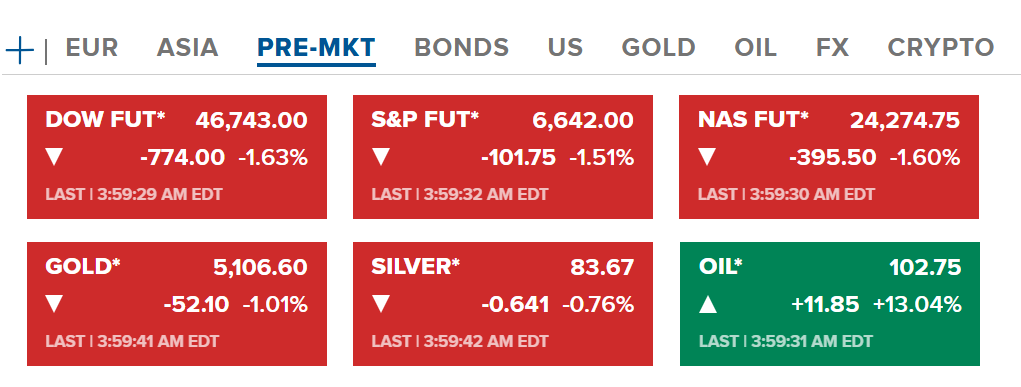 Hợp đồng tương lai của chứng khoán Hoa Kỳ chủ nhật tại Mỹ (08/03-US) đồng loạt giảm đáng kể ở cả ba chỉ số. Hợp đồng vàng và bạc cũng giảm nhẹ quanh 5106 USD/ounce và 83.67 USD/ounce. Riêng dầu tăng mạnh hơn 13% lên quanh 102.75 USD/thùng.
